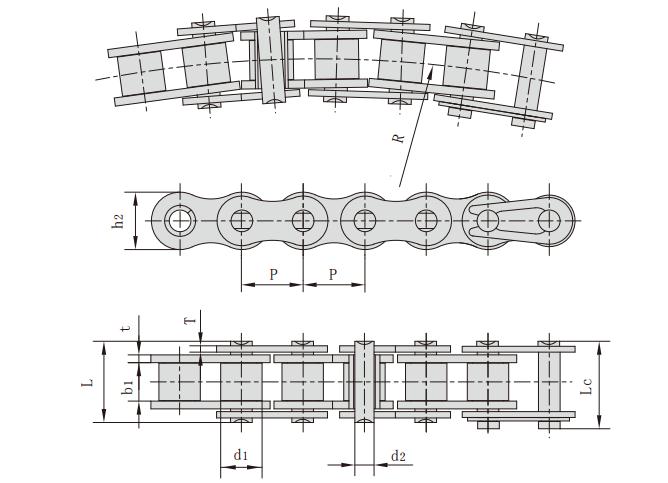 鏈號 節距 滾子直徑 內節內寬 銷軸直徑 銷軸長度 內鏈板高度 鏈板厚度 側彎半徑 抗拉強度 每米長重