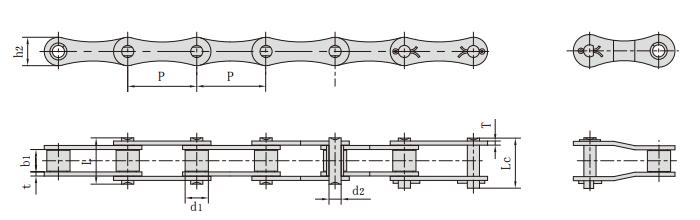 鏈號(hào) 節(jié)距 滾子直徑 內(nèi)節(jié)內(nèi)寬 銷(xiāo)軸直徑 銷(xiāo)軸長(zhǎng)度 內(nèi)鏈板高度 鏈板厚度 破斷載荷 每米長(zhǎng)重