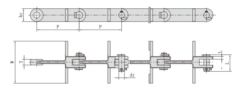 鏈號(hào) 節(jié)距 銷軸直徑 銷軸長(zhǎng)度 鏈板高度 鏈板厚度 附板尺寸 抗拉強(qiáng)度 每米重量