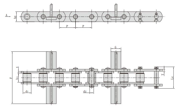 鏈條型號 節(jié)距 滾子直徑 內(nèi)節(jié)內(nèi)寬 銷軸直徑 銷軸長度 內(nèi)鏈板高度 鏈板厚度 附板尺寸 抗拉強度 每米長重