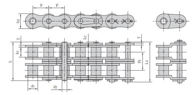 節距 滾子直徑 內節內寬 銷軸直徑 銷軸長度 內鏈板高度 鏈板厚度 排距 抗拉強度 平均抗拉強度 每米長重