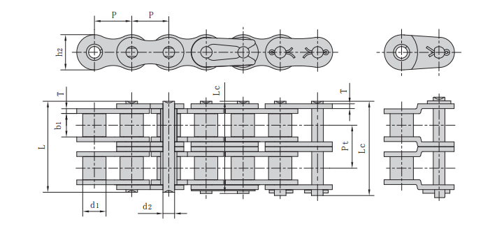 鏈號 節距 滾子直徑 內節內寬 銷軸直徑 銷軸長度 內鏈板高度 鏈板厚度 排距 抗拉強度 平均抗拉強度 每米長重