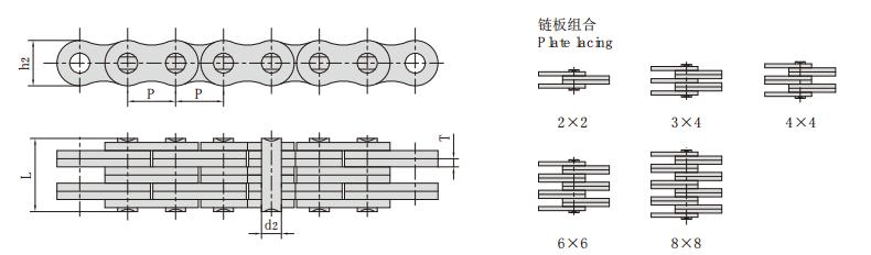 鏈號 節距 鏈板組合 鏈板高度 鏈板厚度 銷軸直徑 銷軸長度 抗拉強度 平均抗拉強度 每米重量