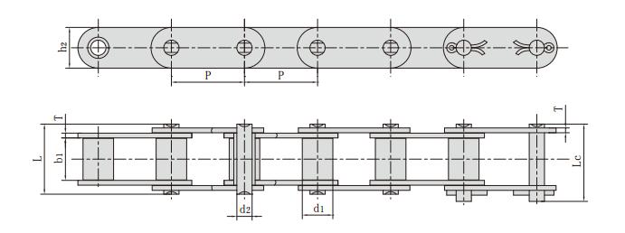 鏈號(hào) 節(jié)距 滾子直徑 內(nèi)節(jié)內(nèi)寬 銷軸直徑 銷軸長度 內(nèi)鏈板高度 鏈板厚度 抗拉強(qiáng)度 平均抗拉強(qiáng)度 每米重量