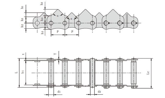 鏈號 節(jié)距 滾子直徑 內(nèi)節(jié)內(nèi)寬 銷軸直徑 銷軸長度 齒形角 鏈板厚度 鏈板尺寸 抗拉強度 平均抗拉強度
