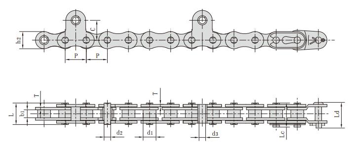 鏈號 節(jié)距 滾子直徑 內節(jié)內寬 銷軸直徑 銷軸長度 內鏈板高度 鏈板厚度 附板尺寸 抗拉強度 平均抗拉強度