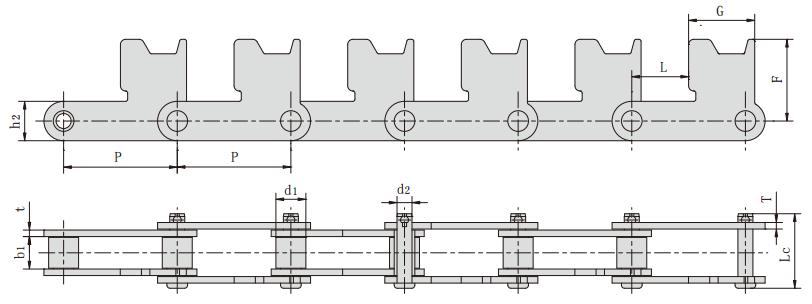 鏈號 節距 滾子直徑 內節內寬 銷軸直徑 銷軸長度 鏈板高度 鏈板厚度 附件尺寸 抗拉強度 每米長重