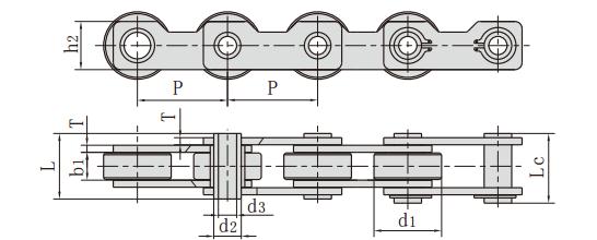 鏈條型號 節距 滾子直徑 內節內寬 銷軸直徑 銷軸長度 內鏈板高度 鏈板厚度 抗拉強度 每米長重